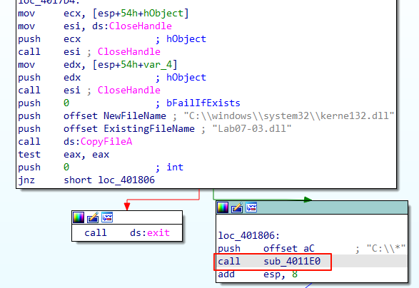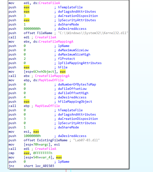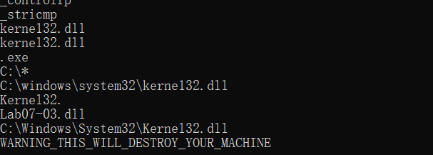 在内存中加载这两个库文件,并将Lab07-03.dll拷贝到”C:\Windows\System32\Kernel32.dll”路径下,伪装成系统文件