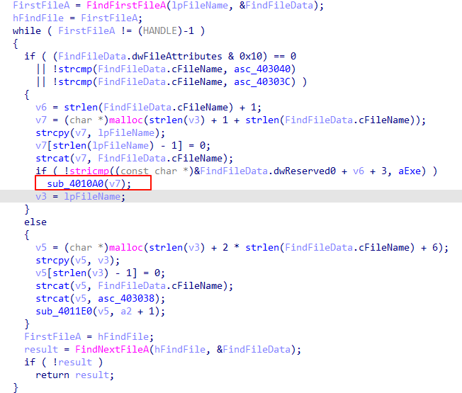 经过初步分析可以得知,此处递归搜索了C盘中的每一个exe程序,并且对其进行了sub_4010A0操作,我们继续深入到该函数中进行分析