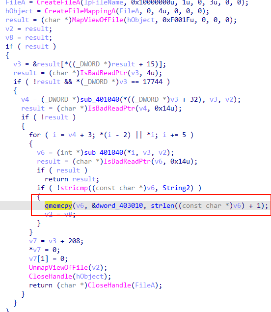 可以看到,这段代码通过内存映射文件的方式修改一个文件的内容,具体来说是将文件的导入表中 kernel32.dll 替换为 kerne132.dll。通过对PE文件结构的解析,精准找到导入表以及对应的kernel32.dll字符串的地址再通过方框中的操作进行替换。