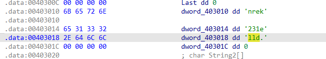 首先使用strings进行exe分析,发现出现kernel32.dll和kerne132.dll,初步估计该程序将使用伪造的dll文件代替原有dll文件