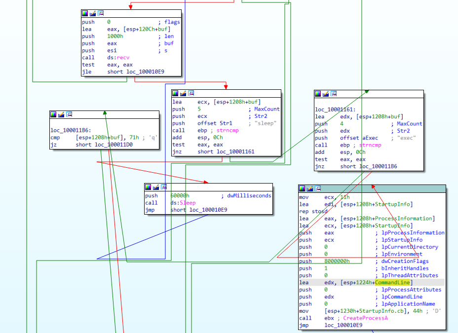 可能接收到3种指令,”sleep”便休眠程序1min,”q”便清理资源退出程序,”exec”便执行该字段后的指令。此时你的终端便已经被远程主机获取。