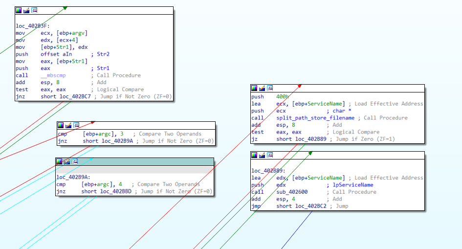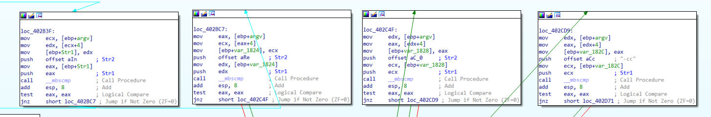 接下来我们继续向下分析,根据代码块结构可以发现是一连串的if判断语句,并且可以判断出来,此处是在比较第一个参数选项与指定字符串是否匹配