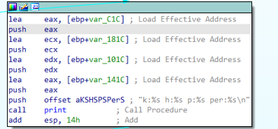 该段代码的作用是,将先前注册表中的项目的值分别复制到这几个地址中。接下来,通过下图中的格式化字符print出具体的值