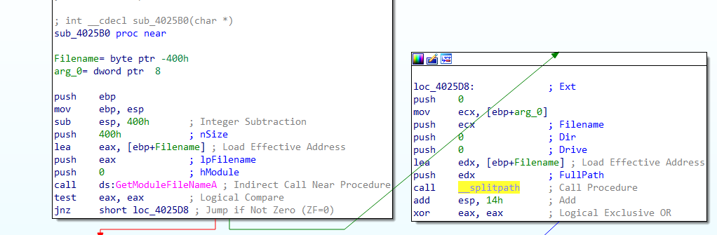 深入第一个函数,观察可发现作用为获取当前运行文件的路径并将路径分解为驱动器、目录、文件名和扩展名,并只将文件名存入到先前的局部参数中