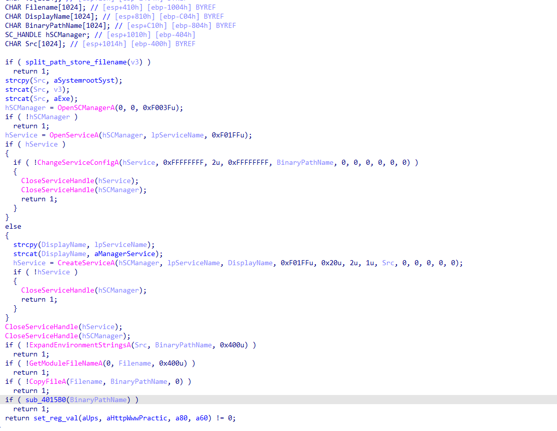 可见其作用是创建服务项,依据服务指定位置,修改环境变量和拷贝对应源程序,并且将该程序的时间戳修改至与kernel32.dll时间戳一致。最后设置注册表值。