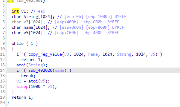 可惜,我的XP虚拟机主机中并没有该项注册表,因此我们分析返回为0的结果,此时将会进入函数sub_402410,我们深入分析该函数。由于IDA中将strcpy和strcat等函数直接使用汇编语句进行展示,不便于分析,因此我们此处可以使用IDA反汇编功能,将汇编代码转化成C语言分析(Tab键即可)