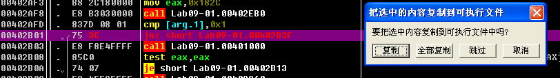 首先在ollydbg中找到对应的跳转点,0x402B01,并将jnz指令后的地址修改为参数比较地址0x402b3f,并且要修复后续参数个数的比较部分,此处我们只用到了-in,-re以及-cc,因此只对这几处参数个数进行修改(鉴于篇幅原因,此处并未列出)
