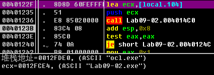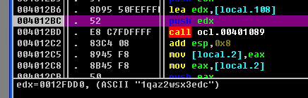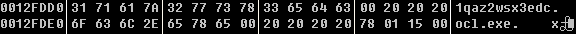 其中strrchr是用于获取程序名称的。并且发现在strcmp后程序立马进行了跳转。因此我们猜测,该程序通过名字是否一致来决定是否运行,在dbg中验证。发现期望程序名为ocl.exe.