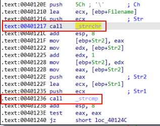 我们在IDA中快速梳理一下逻辑,发现了两个字符串函数strrchr和strcmp