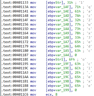 很简单便可以发现,此处对压入的字符串进行了一系列验证:首先长度要为4,其次首位字母为’a’,次位字母为’a’+1=’b’,第三位字母为99=’c’,第四位字母为’c’+1=’d’,结合这个字符串是原本恶意程序的最后一个参数,不难想到,这是程序的密码。如果读者还不熟悉字符串的操作,无法直接看出来密码,也可以使用python脚本进行分析