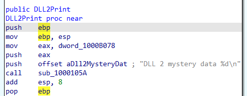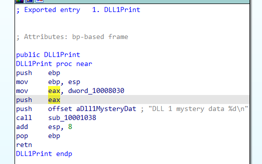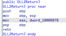 接下来我们分析一下DLL1的调用函数,不难看出,该函数用于打印出DLL1的magic数字,该数字存储在0x10008030,对其交叉引用,看看写入了什么值