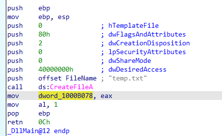 可以看到,此处创建了一个名为temp.txt的文件,并且写入了此地址。可以知道了写入的文件名就是temp.txt了。同时发现,DLL2print的数字恰好为此处变量值