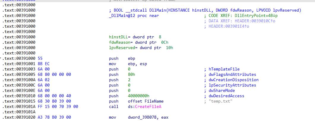 可以看到,此处创建了一个名为temp.txt的文件,并且写入了此地址。可以知道了写入的文件名就是temp.txt了。同时发现,DLL2print的数字恰好为此处变量值