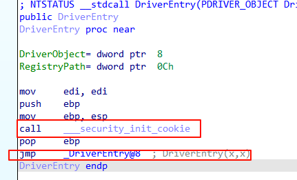 我们进入sys的分析界面以后,可以看到两个跳转,第一个跳转是一个防止栈溢出的函数。如果你熟悉pwn的话,那么该操作其实就是初始化栈中的Canary。第二个跳转便是真正进入Driver主程序的部分