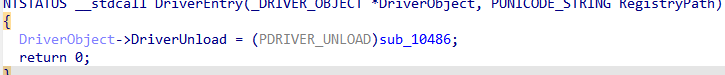 反汇编以后可以发现,主函数的作用就是将sub_10486注册到Driver的回调函数,在驱动被卸载的时候使用