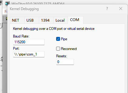 接下来我们打开windbg,准备连接到WinXP虚拟机,在File中选择kernel debugging,配置如下: